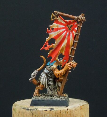 百匹組手の続きです。 クランラットの最後の一匹、コマンドグループのスタンダードベアラーを塗りました。 肉眼だと結構イイ感じに仕上がったつもりでしたが、アップには耐えられないクオリティで恥ずかしいです。 旗の難しいところは、当たり前ですが、何と…